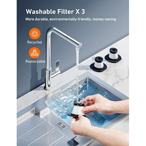 Washable Filter: The filters and dust cup are washable. Extra 2 filters are attached, easy to replace and clean. Please do not wash the body.