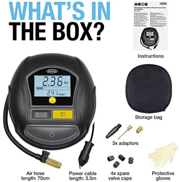Ready for anything. The RTC1000 comes with valve Caps, Latex gloves and a spare fuse. The cable winds away neatly, and the air hose folds away into the Inflator. It also has case to keep everything tidy .