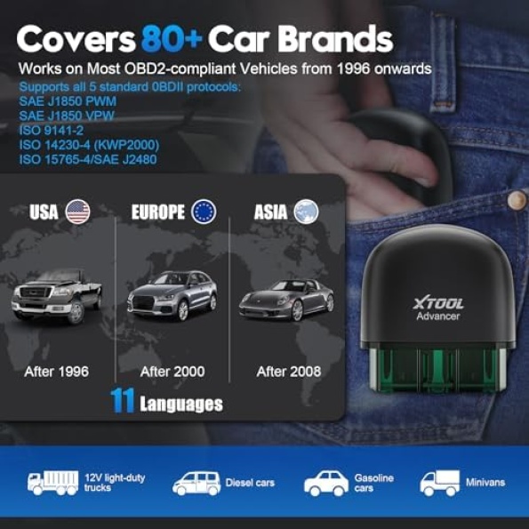 🚙【EXTENSIVE VEHICLE COMPATIBILITY】XTOOL Advancer AD20 PRO car code scanner works on most American( Since 1996), European( Since 2000) and Asian(Since 2008) auto makers sold in the US post 1996 that are OBDII compliant and uses 12 volts, including sedans, light duty trucks, SUVs, mini vans, etc.. It is compatible with all OBDII protocols cars including J1850 PWM, J1850 VPW, ISO9141-2, KWP2000, and SAE J2480. With 11 language available, you can easily switch it to your own language, it is a great options to replace your existing scanner for car.